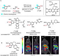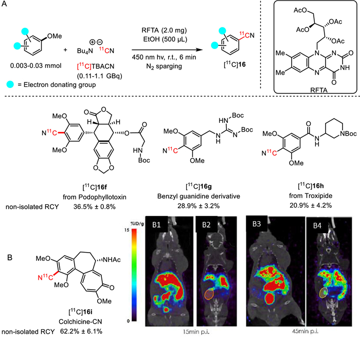 Utilizing their developed photocatalytic [11C]cyanation approaches, Li, Nicewicz, and co-workers successfully realized late-stage radiolabeling of a wide range of drug candidates and natural products with a pyrogallol core. As shown in Fig. 20A, with riboflavin tetraacetate (RFTA) as photocatalyst, late-stage [11C]cyanation of podophyllptoxin, colchicine, benzyl, guanidine derivative, and troxipide readily proceeded to afford the expected radioligands [11C]16f-16i in 20.9%−62.2% non-isolated RCYs. A preliminary PET imaging study of [11C]16i was performed in rodents. As depicted in Fig. 20B, high radioactivity levels were observed in the liver, kidneys, and intestines after intravenous injection of [11C]16i, which is consistent with in vivo distribution pattern of colchicine.
