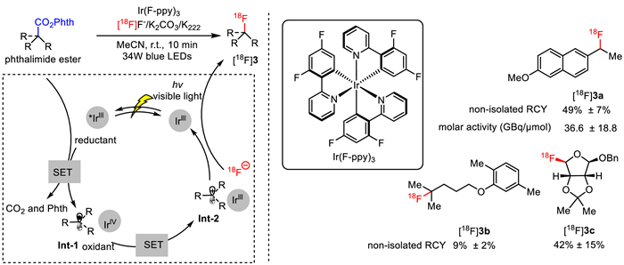 Notwithstanding the great superiority of [18F]NFSI in photocatalytic electrophilic 18F-fluorination of amino acids, its complicated synthesis from [18F]F2, equipment corrosion caused by the requisite use of F2 as a carrier gas, and the relatively low molar activity of produced radioligands strongly limit its widespread use for PET. In this scenario, a reliable alternative approach to effect aliphatic 18F-fluorination resides in direct nucleophilic fluorination with [18F]fluoride, which has been commonly utilized to produce 18F-labeled radioligands with high molar activity and RCY. Towards this end, Doyle and co-workers developed a redox-neutral approach for photocatalytic decarboxylative radiofluorination of N-hydroxyphthalimide esters with nucleophilic [18F]KF (Fig. 3) [44]. With Ir(F-ppy)3 as photocatalyst under blue light-emitting diode (LED) irradiation, various radioligands containing a secondary or tertiary C(sp3)−18F bond were generated very fast at room temperature with excellent molar activity and good non-isolated RCYs, which remains a formidable challenge by conventionally direct nucleophilic radiofluorination of alkyl sulfonates. Notably, even for primary or activated secondary substrates, the harsh reaction conditions (high temperature and high basicity) requisite for sufficient substitution with conventional approaches frequently generate inseparable olefin by-products via β-hydrogen elimination, which is not suitable for late-stage radiofluorination of biomolecules [1,9]. For the reaction mechanism, it was proposed that single-electron transfer (SET) first occurred between the excited Ir(F-ppy)3 and the phthalimide ester to generate phthalimide ester radical anion, which then underwent fragmentation and concomitant CO2 extrusion to produce a carbon-centered radical Int-1 (Fig. 3). This radical intermediate then proceeded another SET process with the oxidized photocatalyst IrIV complex, giving rise to a carbocation Int-2 and turning over the photocatalyst. Finally, the desired 18F-labeled radioligand was obtained by trapping the carbocation with the [18F]fluoride source.
