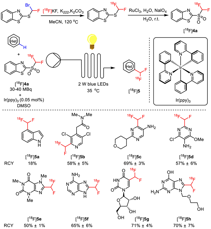 As a continuation of aliphatic 18F-fluorination, Genicot and co-workers developed a new 18F-difluoromethylation reagent based on benzothiazole sulfone (2-[18F]((difluoromethyl)-sulfonyl)benzo[d]thiazole) ([18F]4a) via a two-step nucleophilic radiofluorination with [18F]fluoride and RuCl3 catalyzed oxidation of sulfide to sulfone (Fig. 4). Furthermore, they applied this new CHF18F reagent in photocatalyzed 18F-difluoromethylation of N-heteroaromatics using flow chemistry to accelerate the reaction rate by maintaining a better solution irradiation. With Ir(ppy)3 as the photocatalyst under irradiation of 2 W blue LEDs at 35 ℃, a wide range of N-heteroaromatics including indoles, pyridines, pyridazines, pyrimidines, 1H benzoimidazoles, 1H-pyrrolo[2,3-b]pyridine and 1H-pyrazolo[3,4-b]pyridine were successfully 18F-difluoromethylated in 2 min via direct aromatic C−H activation. As a result, various specific [18F]difluoromethylated N-heterocycles [18F]5 including compounds with scaffolds of medicinal interest, such as xanthine scaffolds ([18F]5e, RCY = 50% ± 1%), nucleic bases scaffolds ([18F]5f, RCY = 65% ± 6%), nucleosides scaffolds ([18F]5g, RCY = 71% ± 4%), and even drug scaffolds ([18F]5h, RCY = 70% ± 7%), were achieved in moderate to good nonisolated RCY. It should be mentioned that the total radiosynthesis time of this strategy was 90 min, which did not exceed the half-life decay of fluorine-18 atom (110 min) [45].