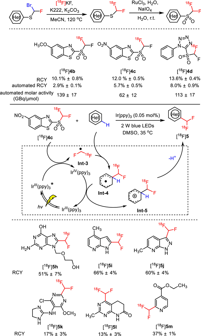 In 2020, Genicot and co-workers further evaluated the influence of different 18F-difluoromethylation reagents on the photocatalytic 18F-difluoromethylation reaction (Fig. 5) [46]. In this work, six structure-related [18F]difluoromethyl heteroaryl-sulfones were prepared, and fully automated two-step production for three of them were realized with favorable isolated RCYs (2.9% ± 0.1% for [18F]4b, 5.7% ± 0.5% for [18F]4c, and 8.0% ± 0.9% for [18F]4d) and improved molar activity (139 ± 17 GBq/µmol for [18F]4b, 62 ± 12 GBq/µmol for [18F]4c, and 113 ± 17 GBq/µmol for [18F]4d). These three new 18F-difluoromethylation reagents all enabled to radiolabel a variety of N-heteroaromatics despite with slightly reduced nonisolated RCYs (13%−66%) compared with that using [18F]4a. The underlying mechanism of this reaction was proposed to involve radical intermediates as revealed in Fig. 5. The [18F]CF2H radical Int-3 was first generated by the oxidative quenching between [18F]difluoromethylating reagents with the excited state of Ir(ppy)3 under light irradiation. Then [18F]heteroaryl-CF2H radical species Int-4 was produced via the addition of radical Int-3 onto N-heteroaromatic rings, which was further oxidized by the intermediate Ir(IV)(ppy)3 to afford cationic intermediate Int-5, concomitantly turning over the Ir(ppy)3 photocatalyst. Finally, deprotonation of intermediate Int-5 arrived at the desired [18F]heteroaryl-CF2H derivatives.