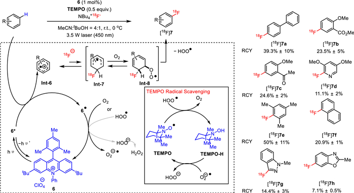Towards this end, in 2019, Li, Nicewicz and co-workers disclosed a very mild photocatalytic 18F-fluorination of arene C–H bonds with [18F]fluoride [49], which surmounted the problems regarding to functionality incompatibility and poor molar activity when electrophilic [18F]F2, [18F]NFSI, or [18F]Selectfluor was applied to enable C–H 18F-fluorination of aromatics. As shown in Fig. 6, with an acridinium based compound 6 as a photocatalyst, TEMPO (2,2,6,6-tetramethyl-1-piperidine 1-oxyl) as a redox co-mediator, 18F-tetrabutylammonium fluoride (NBu4+18F−, [18F]F−NBu4+, [18F]TBAF) as a radiofluorinating agent, tetrabutylammonium bisulfate as a phase transfer agent, and oxygen air as oxidant, a wide range of 18F-labeled aromatics [18F]7 were produced from the corresponding aromatic substrates under the irradiation of a 3.5 W laser (450 nm) in a solvent of MeCN and t-BuOH (4:1) for 30 min. A moderate to good RCY ranging from 4.9% to 50% was achieved by this method. The total radiosynthesis time of this reaction, including purification, was about 50–60 min, which supported the practical translation of this photocatalytic 18F-labeling approach into human use. A probable reaction mechanism was also proposed. As depicted in Fig. 6, a radical cation intermediate Int-6 was first generated via a single electron transfer between arene and activated photocatalyst 6. Subsequent combination of Int-6 with fluorine-18 proceeded to give the radical species Int-7, which was then trapped by oxygen to afford Int-8. Finally, elimination of a hydroperoxyl radical (HOO•) from Int-8 occurred to arrive at the desired [18F]fluorinated products.