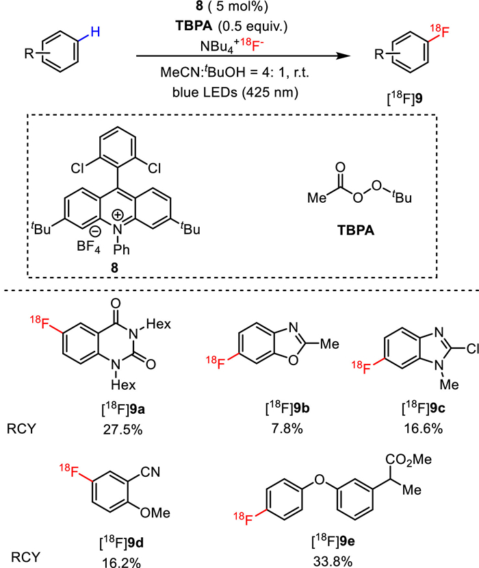 Later in 2020, Li, Nicewicz and co-workers improved this approach by replacing the previously used laser with a readily available low-energe blue LED light source and involving tert‑butyl peroxyacetate (TBPA) as the terminal oxidant (Fig. 7) [50]. A microtubing reactor was utilized to increase the light influx by enhancing the surface area that was exposed to the LED light. The feasibility to omit the azeotropic drying process for C−H radiofluorination was also demonstrated, which remarkably simplified the radiolabeling workflow. As a result, direct 18F-fluorination of various C−H bonds in a wide range of electron-rich aromatics and heteroaromatics were obtained with moderate to good RCYs under the optimized conditions. For instance, in the presence of [18F]F−NBu4+, TBPA, photocatalyst 8 and a solvent mixture of MeCN and t-BuOH (4:1) under blue LED illumination, [18F]9a, [18F]9b, [18F]9c, [18F]9d, and [18F]9e were produced in 27.5%, 7.8%, 16.6%, 16.2% and 33.8% RCYs, respectively.