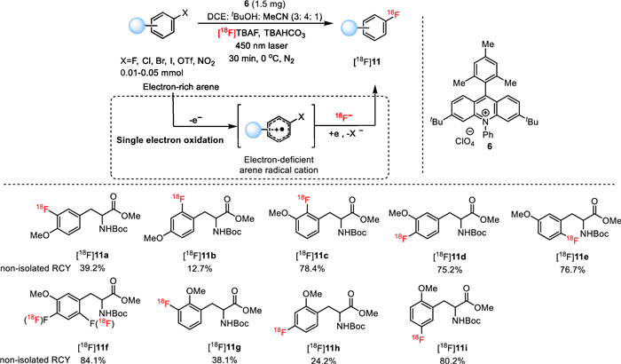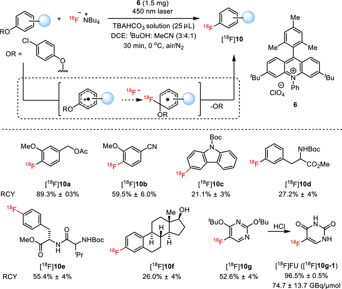 Although SNAr has been routinely applied for radiofluorination of aromatic molecules, this strategy is generally limited to electron-deficient arenes, which is ascribed to the kinetic barriers during the processes of C–F bond formation. In 2020, Li, Nicewicz and co-workers successfully developed a polarity-reversed photocatalyzed deoxyfluorination reaction to achieve radiofluorination of electron-rich arenes via cation-radical-accelerated SNAr [51]. As displayed in Fig. 8, 18F-fluorination of a broad array of arylethers was site-selectively achieved at the more electron-rich aromatic moiety over the less-oxidizable arene nucleofuge by empolying [18F]TBAF as a fluorine source, tetrabutylammonium bicarbonate (TBAHCO3) as a phase transfer agent, acridinium 6 as the photocatalyst in the solvent of 1,2-dichloroethane (DCE): t-BuOH: MeCN (3:4:1) under laser light irradiation (450 nm) for 30 min. Additionally, deoxyradiofluorination was also feasible at the meta position relative to the electron-rich substituent ([18F]10d), suggesting that the substates for this reaction are not limited to those with ortho or para electron-donating groups ([18F]10a-c). With this approach, 18F-fluorinated oestrogen derivatives were obtained in moderate to good RCYs ([18F]10f), providing potential alternatives to radioligand [18F]FES, which serves to visualize and quantify progesterone and oestrogen receptors in primary and metastatic breast cancers [52,53]. The practability of this approach was further highlighted by the highly efficient synthesis of [18F]10g in excellent RCY, which can be readily deprotected to afford [18F]FU ([18F]10g-10l), an important PET tracer for colon cancer [54], with excellent molar activity.