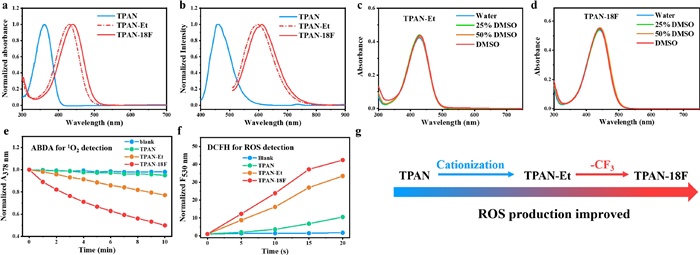 | Fig. 2. Normalized absorbance (a) and fluorescence (b) spectrum of TPAN, TPAN-Et and TPAN-18F in DMSO. λex = 365 nm for TPAN, λex = 488 nm for TPAN-Et and TPAN-18F. (c) Absorbance of 20 µmol/L TPAN-Et in different solvents. (d) Absorbance of 20 µmol/L TPAN-18F in different solvents. (e) Time-course plots of ABDA decomposition versus irradiation time at A378 nm, A378 nm represents the normalized absorbance at 378 nm. ABDA for 1O2 detection. [PSs] = 5 µmol/L and [ABDA] = 75 µmol/L. (f) Time-course plots of DCFH decomposition versus irradiation time at F530 nm, F530 nm represents the normalized fluorescence intensity at 530 nm. DCFH for ROS detection. [PSs] = 5 µmol/L and [DCFH] = 75 µmol/L. White light irradiation (85 mW/cm2). (g) Schematic diagram of changes in photosensitivity of TPAN, TPAN-Et and TPAN-18F after modification. | |