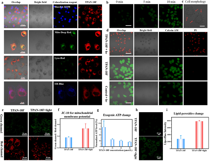 | Fig. 3. (a) Fluorescence images of HeLa cells co-stained with TPAN-18F (5 µmol/L) and co-localization reagent (1 µmol/L). 1st column: overlap image, 2nd column: bright field, 3rd column: co-localization reagent, and 4th column: TPAN-18F. Hoechst 33258: λex = 405 nm, collection channel: 425–475 nm. Mito-Deep Red: λex = 640 nm, collection channel: 663–738 nm. Lyso-Red: λex = 561 nm, collection channel: 663–738 nm. ER-Blue: λex = 405 nm, collection channel: 425–475 nm. TPAN-18F: λex = 488 nm, collection channel: 570–620 nm. (b) Intracellular (HeLa cells) ROS production after TPAN-18F (1 µmol/L) under white light irradiation (85 mW/cm2) for different time. DCFH-DA (30 µmol/L): λex = 488 nm, collection channel: 500–550 nm, scale bar: 50 µm. (c) The cell (HeLa cells) morphology after TPAN-18F (1 µmol/L) under white light irradiation (85 mW/cm2), scale bar: 10 µm. Red arrows showed obvious bubbles. (d) Cell viability assays for HeLa cells incubated with TPAN-18F (5 µmol/L) in the absence and presence of light irradiation, scale bar: 50 µm. 1st column: overlap image, 2nd column: bright field, 3rd column: Calcein-AM (2 µmol/L), λex = 488 nm, collection channel: 500–550 nm, 4th column: PI (4.5 µmol/L), λex = 561 nm, collection channel: 570–620 nm. (e) Confocal fluorescence imaging of MMP in HeLa cells with different treatment via JC-10 staining, TPAN-18F10 µmol/L. Green channel: λex = 488 nm, collection channel: 500–550 nm. Red channel: λex = 561 nm, collection channel: 570–620 nm. (f) The corresponding fluorescence intensity from e. (g) Relative intercellular ATP level at different TPAN-18F concentrations after light irradiation. The ATP levels were detected according to the ATP content detection kit. (h) Confocal fluorescence imaging of LPO with Liperfluo under different conditions. Green channel: λex = 488 nm, collection channel: 500–550 nm. (i) The corresponding fluorescence intensity from h. Data were displayed as mean ± standard deviation (s.d.), derived from independent biological samples (n = 3). | |