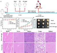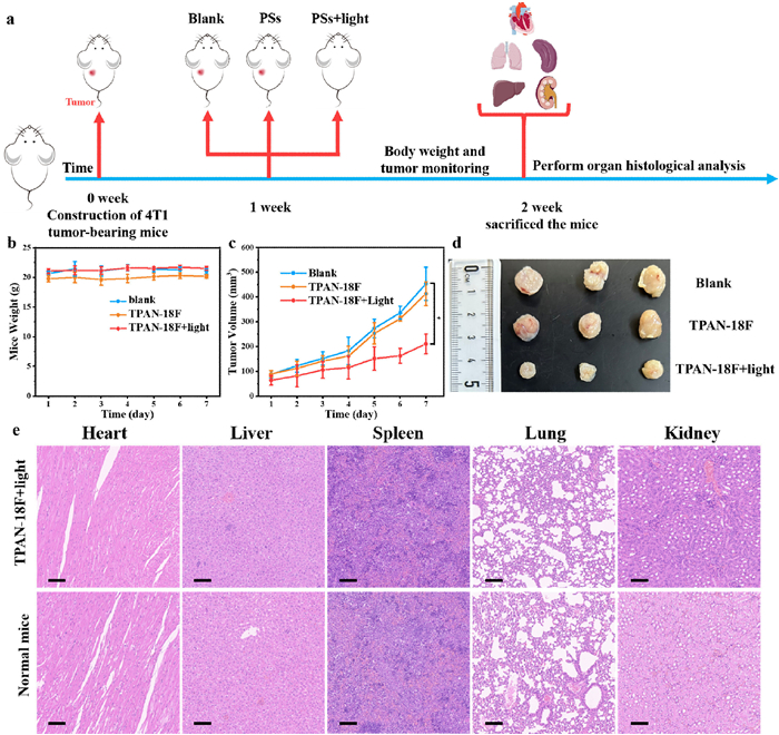 | Fig. 4. (a) The relevant experiment of 4T1 tumor-bearing mice, TPAN-18F: 300 µmol/L (containing 5% EtOH) in PBS, 50 µL. White light irradiation (85 mW/cm2). (b) Weight curves of experimental mice, n = 3. (c) Tumor growth changes of experimental mice. Data were displayed as mean ± s.d., derived from independent biological samples (n = 3), P < 0.05, and statistical significance was assessed through the unpaired two-sided student t-test. (d) Photos of tumor from different groups of experimental mice. (e) Histology studies of indicated mice: different organs, scale bar: 100 µm. | |