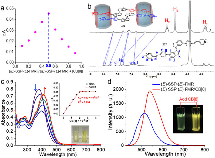 | Fig. 1. (a) Host-guest binding stoichiometry of (E)-SSB-(E)-FMR with CB[8]. Job plot for the complexation of (E)-SSB-(E)-FMR with CB[8] in water at 25 ℃. Absorption changes recorded at 408 nm for (E)-SSB-(E)-FMR. The sum of the total concentrations of hosts and guests was kept constant (2 × 10−5 mol/L). (b) 1H NMR spectral contrast of (E)-SSB-(E)-FMR and (E)-SSB-(E)-FMR/CB[8]. (c) UV–vis titration spectra of (E)-SSB-(E)-FMR (2 × 10−5 mol/L) upon addition of CB[8] ((0~4) × 10−5 mol/L) in water. Inset: Nonlinear least-squares fit of the absorbance changes (ΔA) at 408 nm to determine the complex stability constant (KS) as 1.14 × 108 L/mol; The color change of (E)-SSB-(E)-FMR (left) and assembly (E)-SSB-(E)-FMR/CB[8] (right) in water. (d) Fluorescence spectra of (E)-SSB-(E)-FMR and assembly (E)-SSB-(E)-FMR/CB[8]; Inset: fluorescence photographs of (E)-SSB-(E)-FMR and assembly (E)-SSB-(E)-FMR/CB[8] under 365 nm UV light (λex = 400 nm). | |