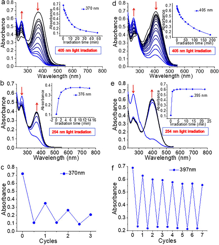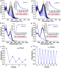 | Fig. 2. (a) UV–vis spectral variation of (E)-SSB-(E)-FMR (2.0 × 10−5 mol/L) upon 405 nm light irradiation; Inset: Variation curve of the absorbance at 370 nm with increasing 405 nm irradiation time. (b) UV–vis spectral variation of the resultant sample a (2.0 × 10−5 mol/L) upon 254 nm light irradiation; Inset: Variation curve of the absorbance at 376 nm with increasing 254 nm irradiation time. (c) The absorbance changes at 370 nm for (E)-SSB-(E)-FMR observed upon alternating visible-light (405 nm) and UV (254 nm) irradiation. (d) UV–vis spectral variation of (E)-SSB-(E)-FMR/CB[8] (2.0 × 10−5 mol/L) upon 405 nm light irradiation; Inset: Variation curve of the absorbance at 405 nm with increasing 405 nm irradiation time. (e) UV–vis spectral variation of the resultant sample d (2.0 × 10−5 mol/L) upon 254 nm light irradiation; Inset: Variation curve of the absorbance at 395 nm with increasing 254 nm irradiation time. (f) The absorbance changes at 397 nm for (E)-SSB-(E)-FMR/CB[8] observed upon alternating visible-light (405 nm) and UV (254 nm) irradiation. | |