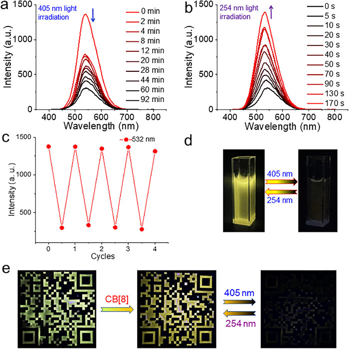 The above investigations inspired us to inspect whether its fluorescence could be modulated by distinct light. Interestingly, when irradiated at 405 nm light for 92 min, fluorescence emission maximum intensity of (E)-SSB-(E)-FMR/CB[8] at 539 nm was strongly quenched by 78% (Fig. 3a). Intuitively, strong yellow fluorescence turned to be dark through fluorescence photograph under 365 nm UV light (Fig. 3d). Subsequently, the quenched fluorescence intensity and photograph (under 365 nm light) of the resultant irradiated sample above were further thoroughly regained to its original level upon continuous irradiation at 254 nm light for 170 s (Figs. 3b and d). Significantly, the above light-driven fluorescence switching cycle was repeatable for at least four times without any apparent deterioration as a result of excellent photoreaction reversibility (Fig. 3c).