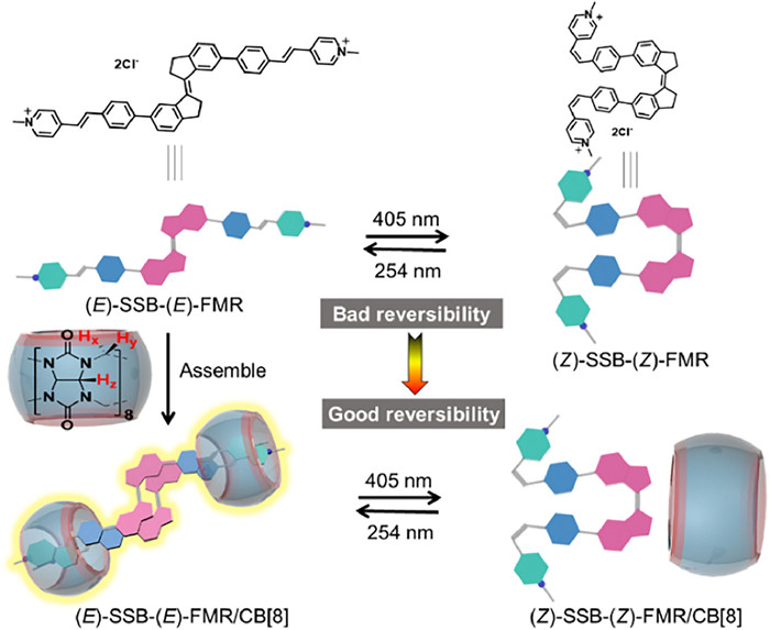 Stimulation response exists widely in nature. For imitating nature, a variety of stimuli-responsive intelligent systems have been constructed and aroused growing attention from researchers for application in drug delivery [1,2], microrobots and nanorobots [3], printing devices [4], liquid crystals [5], tissue engineering [6], intelligent photoluminescence [7-11], molecular machines [12,13] etc. In general, to endow their modulated function, the fabrication of these systems requires to import a number of stimulus-responsive groups. Among numerous stimulating factors such as acid-bases, temperature, pressure, host and guest, redox, magnetism, light seems to be an ideal stimulus as it can be delivered with high spatiotemporal precision, light of a specific wavelength can be selected, and no chemical waste is produced in the system [14]. Therefore, rational introduction of photoactive units is greatly essential and crucial for successful construction of photoinduced intelligent systems. Undoubtedly, supramolecular noncovalent complexation becomes a simple and convenient way for developing the systems, which can avoid complicated and fussy synthetic procedures. All sorts of molecular photoswitches have been handily incorporated to prepare photoinduced supramolecular materials via host-guest complexation, electrostatic interaction, hydrophobic effect and so on [15-17]. Among the nowadays most frequently studied and utilized photoswitches are azobenzene, stilbene, diarylethene, spiropyran, and hydrazone [18-20]. Stiff-stilbene molecular switches can undergo a large geometrical conversion upon reversible isomerization between (Z)- and (E)-configuration upon distinct ultraviolet light, and was extensively utilized to fabricate intelligent supramolecular and biological systems [21-23]. However, many of the reported stiff-stilbene derivatives do not have satisfying photoisomerized reversibility [24-27], which is a current problem that needs to be urgently addressed, as far as we know. In consequence, it is of great significance but challenging to precisely and effectively improve the photoisomerization fatigue resistance of stiff-stilbene. To date, the inclusion of macrocyclic hosts has been used to modulate photoisomerization behaviors of molecular photoswitches such as diarylethene [28,29]. These successes indicate that it is feasible to employ macrocycle-based supramolecular assembly strategies to ameliorate photoisomerized performance of stiff-stilbenes, making them more comfortable with the material functions. However, so far, the strategies using host-guest complexation to inhibit photodecomposition photochromic molecules particularly stiff-stilbenes and accurately improve its photoswitching reversibility have not been reported, to the best of our knowledge.
