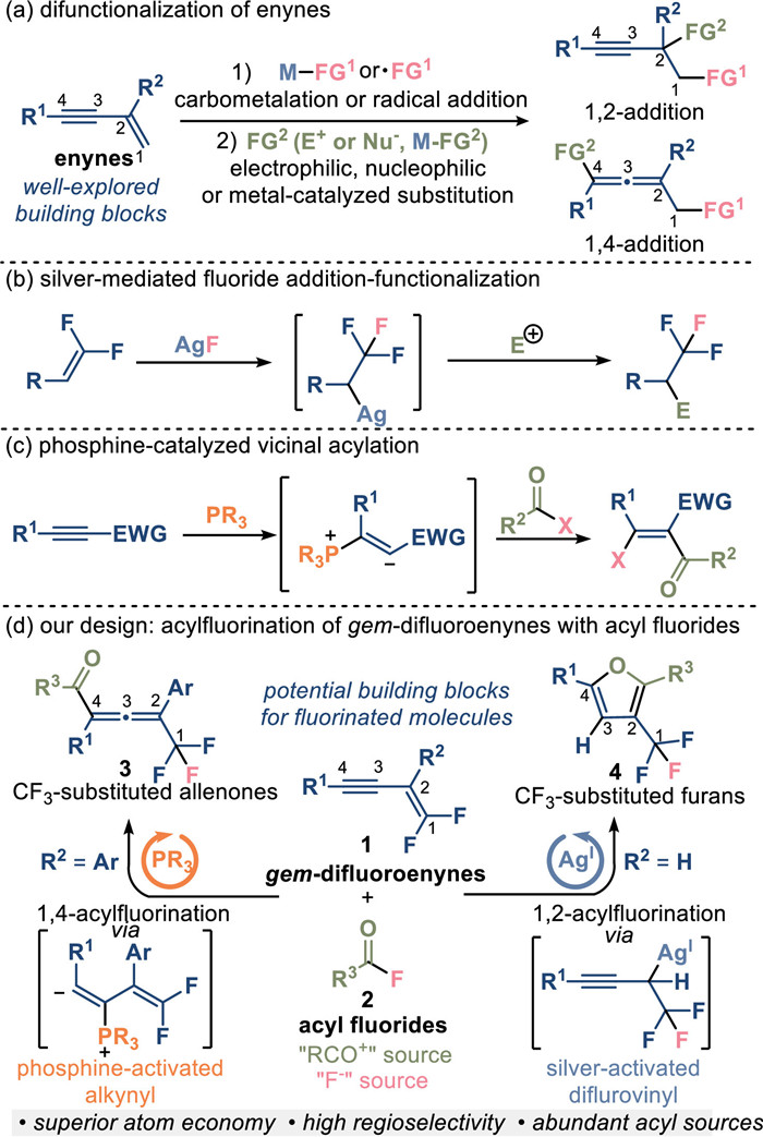 Enynes, as highly adaptable building blocks, manifest the capacity to engage in diverse transformations, resulting in regiodivergent difunctionalized products [1-9]. For instance, 1, 2-addition engenders disubstituted alkynes, while 1, 4-addition furnishes difunctionalized allenes (Fig. 1a). Given the pivotal role of molecules containing trifluoromethyl (CF3) moiety in chemistry [10-17], extensive research endeavors have been dedicated to devising methodologies that enable the introduction of trifluoromethyl groups into intricate molecules [18-27]. The gem-difluoroenynes (1) are a class of distinctive enyne derivatives that are easily obtainable but rarely investigated [28-32]. This kind of derivative possesses both a difluoroalkenyl and an electron-deficient alkynyl group. The addition of fluoride to the difluoroalkenyl component offers an efficient route to furnish CF3-substituted molecules (Fig. 1b) [33-37].
