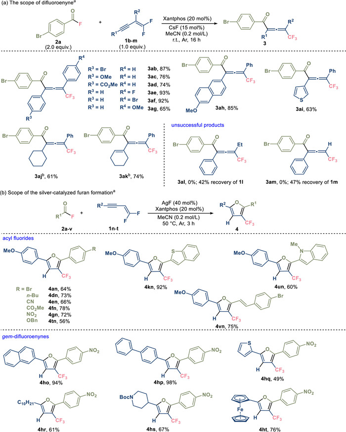 With the alkyl group or hydrogen in 2-position of gem-difluoroenyne, the corresponding allenone products 3al and 3am were not obtained under the standard conditions (cesium fluoride and Xantphos). However, when switching to silver fluoride, a small amount of furan product (6%) was observed in the reaction mixture. This is in line with our initial hypothesis that silver fluoride could promote the 1, 2-addition of enynes and intramolecular annulation to afford trifluoromethylated furans (Fig. 1d). We subsequently attempted to optimize the catalylic condition of this 1, 2-acylfluorination. The reaction cannot proceed in the absence of silver fluoride and the addition of 20 mol% phosphine promoted the reaction. But the excess amount of the phosphine would interfere with the enyne and detriment the furan formation. After screening the amount of catalyst loading and reaction temperature, 72% yield of furan 4gn can be acheived with 40 mol% of silver fluoride and 20 mol% of Xantphos at 50 ℃ (for details see Table S3 in Supporting information).