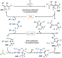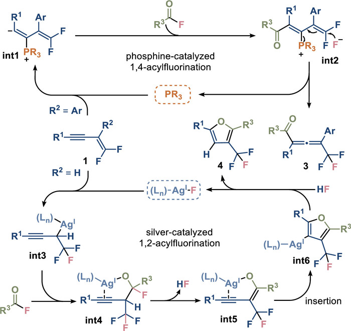 Based on the experiments, a proposed catalytic cycle is depicted in Scheme 3. In instances where the gem-difluoroenyne (1) bears an aryl substituent in 2-position, the phosphine undergoes addition to the electron-deficient triple bond, yielding the β-phosphonium α-carbanion species (int1). Subsequent nucleophilic substitution between the carbanion and the acyl fluoride leads to the formation of an acylated phosphonium species (int2) with a conjugated structure. The electrophilicity of the system facilitates fluoride ion addition to the difluoromethylene group, resulting in the formation of the allenone product 3. When the substituent of 2-position in the gem-difluoroenyne 1 is hydrogen, the compound undergoes initial fluorination mediated by the silver fluoride catalyst. The control experiments suggested that a stable coordination between silver, alkyne and carbonyl that facilitates the acylation of difluoroalkenes and subsequent cyclization (Schemes S2 and S3 in Supporting information). The ensuing propargyl silver species (int3) reacts with the acyl fluoride to generate int4 and then it will transfer to an alkynyl-coordinated silver enolate (int5), accompanied by elimination of hydrogen fluoride. Subsequent migration insertion precipitates the formation of a silver furanate (int6). Acidification of the silver furanate with hydrogen fluoride regenerates the silver fluoride catalyst, liberating the furan product (4).