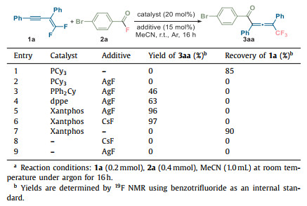 However, no discernible acylfluorinated products were observed initially (Table 1, entry 1). Subsequent experimentation involving the utilization of phenyl-substituted phosphine in conjunction with additional silver fluoride led to successful promotion of the acylfluorination process, resulting in the identification of trifluoromethyl-substituted allenone (3aa) with a modest yield of 46% (entry 3). After a comprehensive assessment of various phosphine ligands (entries 2–5 in Table 1, for more details see Table S1 in Supporting information), we found that Xantphos (4, 5-bis(diphenylphosphino)-9, 9-dimethylx-anthene) was an effective catalyst that afforded the allenone product in 96% yield (entry 5). Notably, the additive silver fluoride could be substituted with cesium fluoride, yielding identical outcomes. Thus, silver was not necessary for this reaction. The phosphine could promote the allenone formation in the presence of the fluoride ion exclusively (entry 6). The control experiments (entries 7–9) resulted in no reaction when using solely the Xantphos catalyst or the metal fluoride additives. The relative equivalence of fluoride yielded negligible influence on the reaction outcome (Table S2 in Supporting information), implying that acyl fluorides serve both as acylating and fluorinating agents in a high atom-economic manner. It is noteworthy that no detection of 2-position-acylated products across all optimization experiments.
