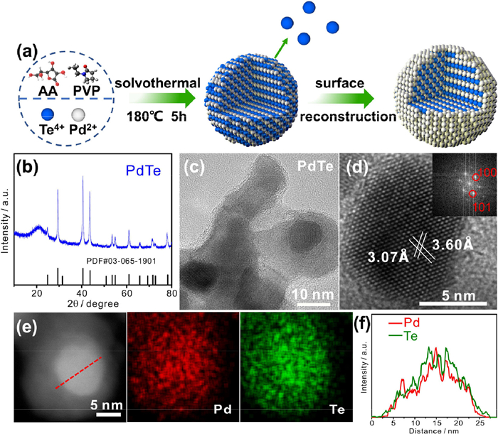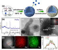| Fig. 1. (a) Schematic diagram of the synthesis for o-PdTe@Pd. (b) XRD pattern, (c) TEM image and (d) HRTEM image of PdTe. Inset shows the corresponding FFT image. (e) STEM and corresponding elemental mappings of PdTe. (f) EDX line scan across the PdTe as indicated by the dashed line in (e). | |