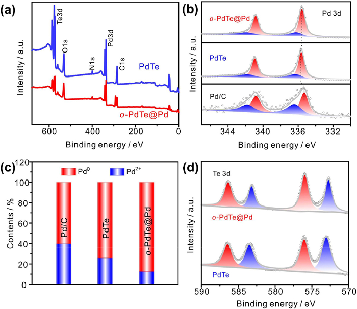 | Fig. 2. (a) XPS survey spectra of PdTe and o-PdTe@Pd. (b) Pd 3d of Pd/C, PdTe and o-PdTe@Pd. (c) The contents of Pd species in Pd/C, PdTe and o-PdTe@Pd. (d) Te 3d of PdTe and o-PdTe@Pd. | |