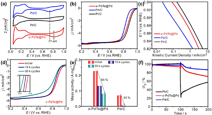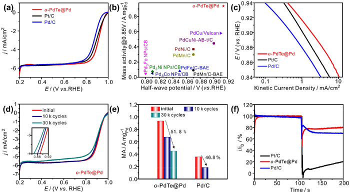 | Fig. 4. (a) LSV curves of o-PdTe@Pd, Pt/C and Pd/C catalysts. (b) Comparison of MA for o-PdTe@Pd and the reported catalysts. (c) The tafel slops of o-PdTe@Pd, Pd/C and Pt/C. (d) LSV curves of o-PdTe@Pd before and after 10 k cycles. (e) The change of mass activity on o-PdTe@Pd and Pd/C after ADT. (f) Methanol tolerance of o-PdTe@Pd, Pd/C and Pt/C. | |