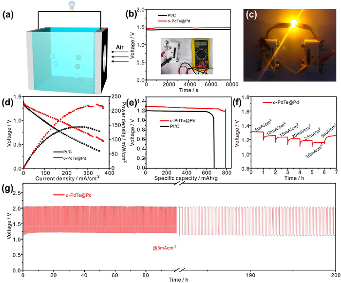 | Fig. 5. (a) Schematic diagram of Zn-air battery. (b) Long-term circle potential testing of o-PdTe@Pd-based and Pt/C-based batteries. The inset is the OCP recorded by a multimeter. (c) Optical images of an LED (1.8–2.2 V) driven by two Zn-air batteries. (d) LSV curves and their corresponding power density curves of Zn-air batteries. (e) Discharge curves of o-PdTe@Pd tested at 5 mA/cm2. (f) Rate capacity under different current density. (g) Long-term galvanostatic discharge and charge curves of o-PdTe@Pd at 5 mA/cm2. | |