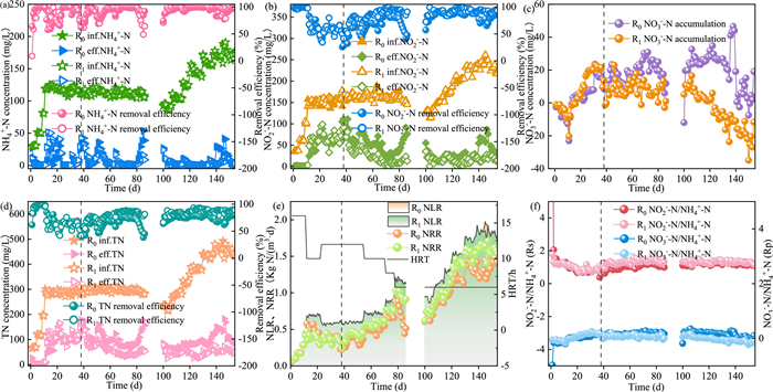 | Fig. 1. Performance of both reactors, R0 and R1, during operation at 15 ± 3 ℃. (a) ammonium nitrogen removal performance, (b) NO2−-N removal performance, (c) NO3−-N accumulation, (d) total nitrogen (TN) removal performance, (e) nitrogen loading rate (NLR), nitrogen removal rate (NRR) and HRT during operation over time, (f) stoichiometric ratios NO2−-N/NH4+-N (Rs), and NO3−-N/NH4+-N (Rp) for both reactors. | |