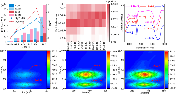 | Fig. 2. (a) EPS content of the sludge samples and its protein (PN), polysaccharide (PS) fractions, (b) particle size distribution during initiation, (c) EPS fourier transform infrared (FTIR) spectra (500–4000 cm−1) of the sludge used as the inoculum and after 154 d of operation in R0 and R1. Three-dimensional fluorescence spectra with (d) inoculum, (e) R0 sludge at 154 d and (f) R1 sludge at 154 d. | |
