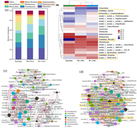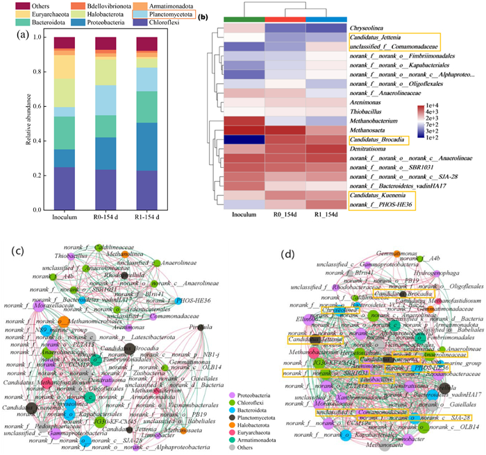 | Fig. 3. (a) Relative abundance of the microbial community at the phylum level, (b) relative abundance at the genus level shown as a heat map. Network analysis of the microbial community in the (c) R0 sludge at 154 d and (d) R1 sludge at 154 d. | |