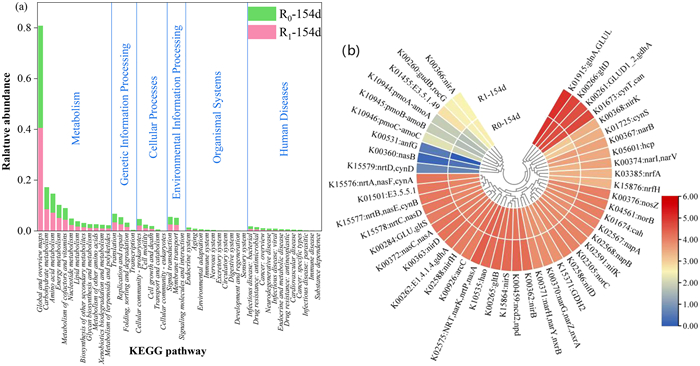 | Fig. 4. (a) Predicted abundance of genes assigned to KEGG pathways. (b) Copy number of KO genes related to nitrogen metabolism. | |