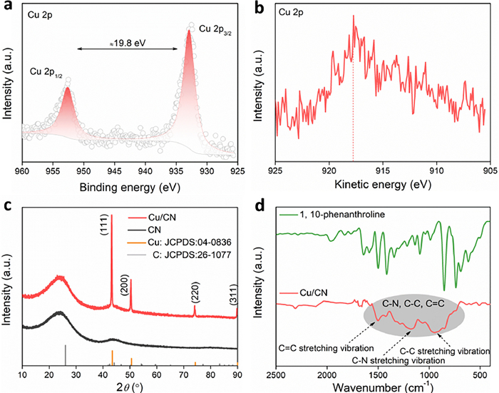 | Fig. 2. XPS spectra (a) and Auger spectra (b) of Cu species in Cu/CN materials. (c) XRD spectra of Cu/CN and CN. (d) FTIR spectra of Cu/CN and 1,10-phenanthroline. | |