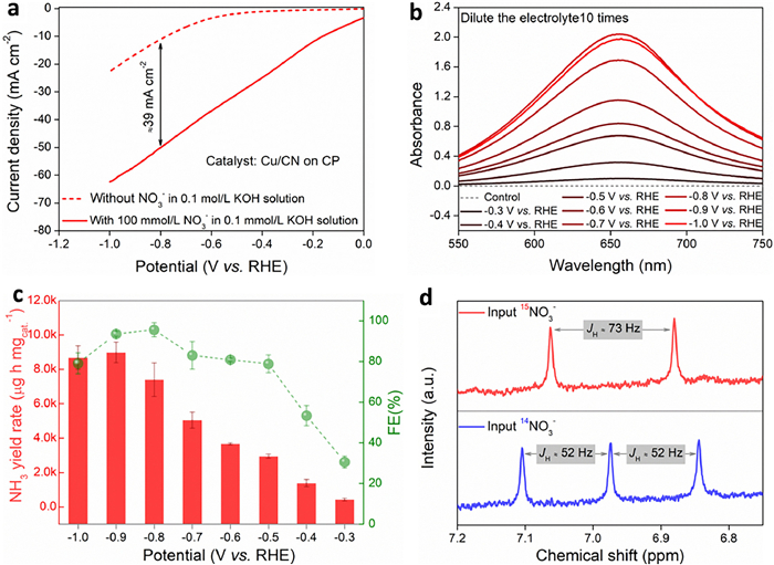 | Fig. 3. (a) The LSV curves collected with Cu/CN as the catalyst, with or without NO3− in the alkaline medium. (b) The ultraviolet-visible spectrum collected after the electrolyte was colorimetric. (c) Ammonia yield rate and FE at different applied potentials in alkaline media. (d) 1H NMR spectrum of the electrolyte after electrolysis for 1 h when NO3− is 14NO3− and 15NO3− respectively. | |