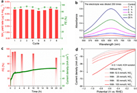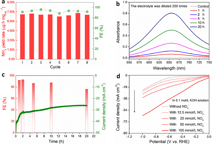| Fig. 4. (a) Ammonia yield rate and FE (−0.9 V vs. RHE) of eNitRR when Cu/CN was reused. (b) Continuous electrolysis for 20 h (in alkaline medium), the UV–vis absorbance of the electrolyte (after colorimetry) in different time periods. (c) Continuous electrolysis for 20 h (in alkaline medium, −0.9 V vs. RHE), FE of eNitRR in different time periods. (d) Effect of initial concentration of NO3− on current response when Cu/CN was used as working electrode. | |