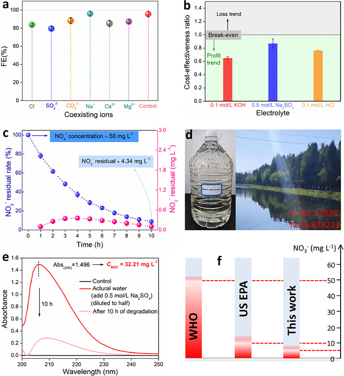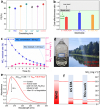| Fig. 5. (a) Effects of coexisting ions on eNitRR driven by Cu/CN in alkaline media. (b) The cost-benefit ratio of ammonia synthesis by eNitRR. (c) Cu/CN as a catalyst to remove NO3− ions in simulated sewage by constant current electrolysis (50 mA, 70 mL electrolyte). (d) The actual sewage collection location and optical image. (e) Cu/CN as a catalyst to remove NO3− ions in actual sewage by constant current electrolysis (50 mA, 70 mL electrolyte). (f) With Cu/CN as the catalyst, the concentration of NO3− ions can be reduced to below the limits specified by WHO and US EPA under electric drive. | |