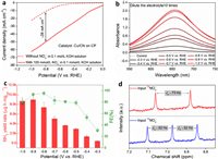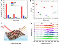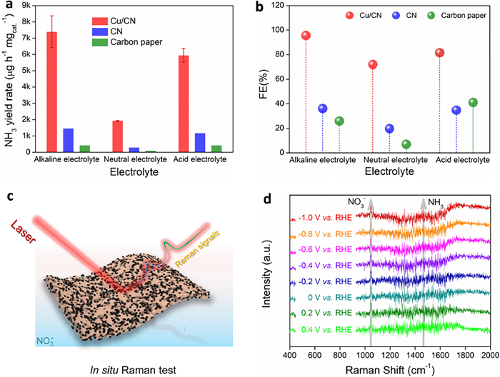 | Fig. 6. The ammonia yield rate (a) and FE (b) of eNitRR when "Cu/CN on carbon paper", "CN on carbon paper", and carbon paper were used as catalysts, respectively. (c) Schematic diagram of testing in situ Raman spectroscopy. (d) Raman spectra collected on the catalyst surface when Cu/CN catalyzed eNitRR. | |