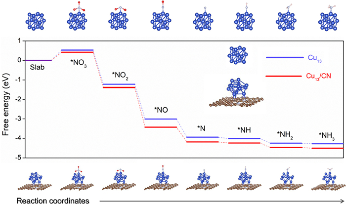 | Fig. 7. DFT calculations. Pathways for the conversion of NO3− to NH3 on model Cu13 and Cu13/CN, respectively, including the Gibbs free energy change of each transition state. Where, the blue ball is Cu atom, the light blue ball is N atom, the red ball is O atom, the brown ball is C atom, and the pink ball is H atom. | |