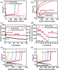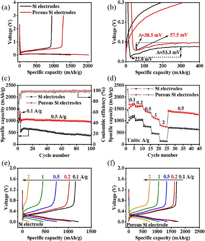 | Fig. 3. (a) Initial charge/discharge curves. (b) Locally magnified curves of (a). (c) Charge/discharge cycling performances and corresponding coulombic efficiency at 0.5 A/g after initial three 0.1 A/g. (d) Rate performances of Si electrodes and porous Si electrodes. Charge/discharge curves of (e) Si electrode and (f) porous Si electrodes at various current densities from 0.1 A/g to 2 A/g. | |