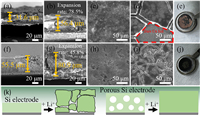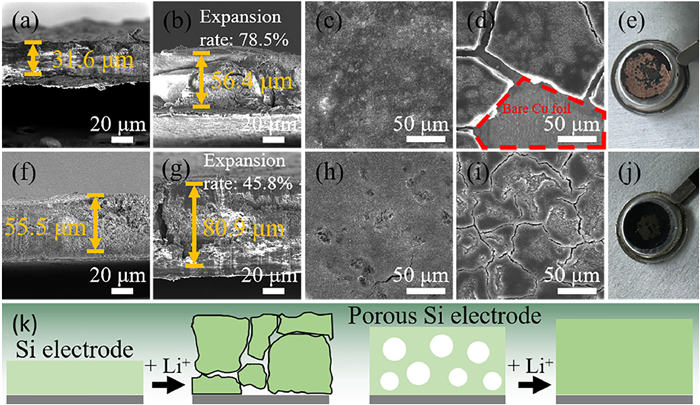 | Fig. 4. SEM images of (a–d) Si electrodes and (f–i) porous Si electrodes (a, c, f, h) before cycling and (b, d, g, i) after 100 cycles: (a, b, f, g) cross-section images and (c, d, h, i) surface images. Photograph of (e) Si electrodes and (j) porous Si electrodes after 100 cycles. (k) Schematic illustration showing the morphology evolution of Si electrodes and porous Si electrodes after cycling. | |