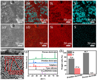 | Fig. 2. In-situ SEM images of porous Si electrodes: (a) Before and (c) after washing away S particles using CS2. Element mapping images: (b) Before and (d) after washing away S particles using CS2. (e) Cross-section SEM image of porous Si electrodes. (f) SEM image of S particles (inset: particle size distribution of S particles). (g) XRD patterns of porous Si electrodes before and after washing sulphur particles using CS2. (h) Si and S element weight ratio of pristine electrode and porous electrode. | |