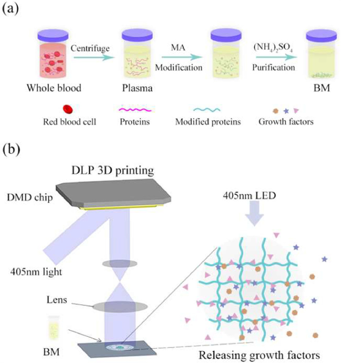 | Fig. 1. Plasma bioinks with growth factor release for bioprinting via photopolymerization. (a) Schematic illustration of the fabrication of Plasma-MA (BM) by chemical modification with methacryloyl (MA) groups. Plasma was obtained from whole blood by centrifugation, then reacted with methacrylic anhydride, and purified by salting out through ammonium sulfate precipitation. (b) Schematic illustration of DLP printed patterned BM hydrogels with growth factor release. | |