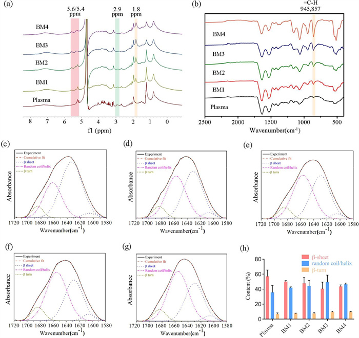 | Fig. 2. Characterization of Plasma-MA. (a) 1H NMR of plasma and BM with different DS. (b) FTIR of plasma and BM with different DS. The deconvolution of amide I peak of plasma (c), BM1 (d), BM2 (e), BM3 (f), and BM4 (g). (h) Quantitative analysis of the secondary structures. Data are shown as mean ± standard deviation (SD, n = 3). | |