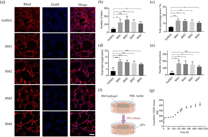 | Fig. 3. Tube formation of HUVECs on BM hydrogels and VEGF release from BM hydrogel. (a) Representative images of cytoskeleton staining of HUVECs. Red color represents rhodamine-phalloidin, and blue color represents 4, 6-diamino-2-phenyl indole (DAPI). Scale bar: 100 µm. (b) Number of tubes. (c) Tube percentage area. (d) Total tube length. (e) Number of junctions. (f) Schematic illustration of in vitro model for growth factor (GF) release. (g) The release profile of VEGF from BM hydrogel. Data are shown as mean ± SD (n = 3). P < 0.05, **P < 0.01, ***P < 0.001. ns, P > 0.05. | |