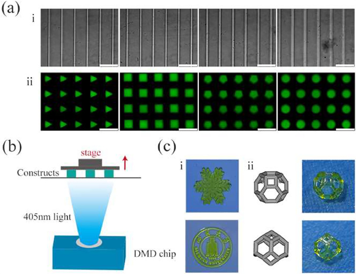 | Fig. 4. Printability of BM for DLP printing. (a) Patterned arrays. (ⅰ) Linear array structures with the design size of 15, 25, 35 and 50 µm from left to right. Scale bar: 200 µm. (ⅱ) FITC labeled pattern array of triangle, square, pentagon, and circle. Scale bar: 500 µm. (b) Schematic illustration of continuous DLP printing technology. (c) Scaffolds with different shapes. (ⅰ) A snowflake-like scaffold and a Sichuan University emblem scaffold. (ⅱ) Complex hollow scaffolds. | |