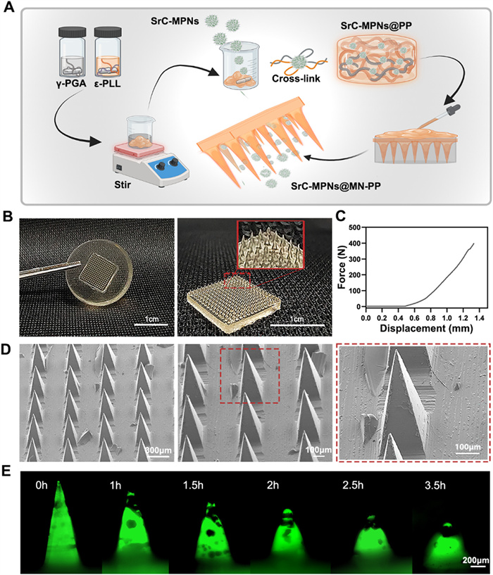 | Fig. 2. Synthesis and attributes of SrC-MPNs@MN-PP. (A) Schematic outlining the SrC-MPNs@MN-PP creation process. (B) Frontal, side, and tip views of the SrC-MPNs@MN-PP microneedle structure. (C) Compressive strength analysis of SrC-MPNs@MN-PP. (D) SEM characterization of SrC-MPNs@MN-PP. (E) Time-lapsed fluorescence imagery of SrC-MPNs@MN-PP within an 80% humidity environment at ambient conditions. | |