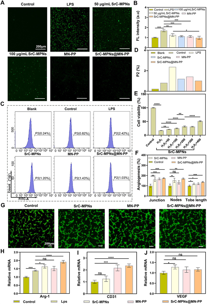 | Fig. 3. Antioxidant and angiogenic assessments of SrC-MPNs@MN-PP. (A) After 24 h of treatment with SrC-MPNs (50, 100 µg/mL), LPS, MN-PP extract, SrC-MPNs@MN-PP extract (containing approximately 100 µg/mL SrC-MPNs), or 10% serum medium (control group), ROS levels were assessed in Raw264.7 cells using DCFH-DA staining (green). (B) Quantitative analysis of ROS generation corresponding to (A). (C) Flow cytometric analysis of ROS in Raw264.7 cells across treatments. (D) Statistical analysis of Raw264.7 cells after ROS fluorescence staining, corresponding to image (C). (E) Assessment of human dermal fibroblasts post 24 h co-culture with SrC-MPNs and 30-minute incubation with 3 mmol/L H2O2; control group used 10% serum medium. (F) Quantitative metrics on junctions, nodes, and tube lengths across treatments. (G) Representative fluorescence images of HUVECs and different treatment groups after co-culture for 6 h on the cured substrate. (H–J) RT-qPCR analyses of Arg-1, CD31, VEGF post 48-h treatments. Statistical interpretations were drawn from n = 3 samples per group; All experimental results were expressed as a mean ± SD. P < 0.05, **P < 0.01, ***P < 0.001, ****P < 0.0001. | |
