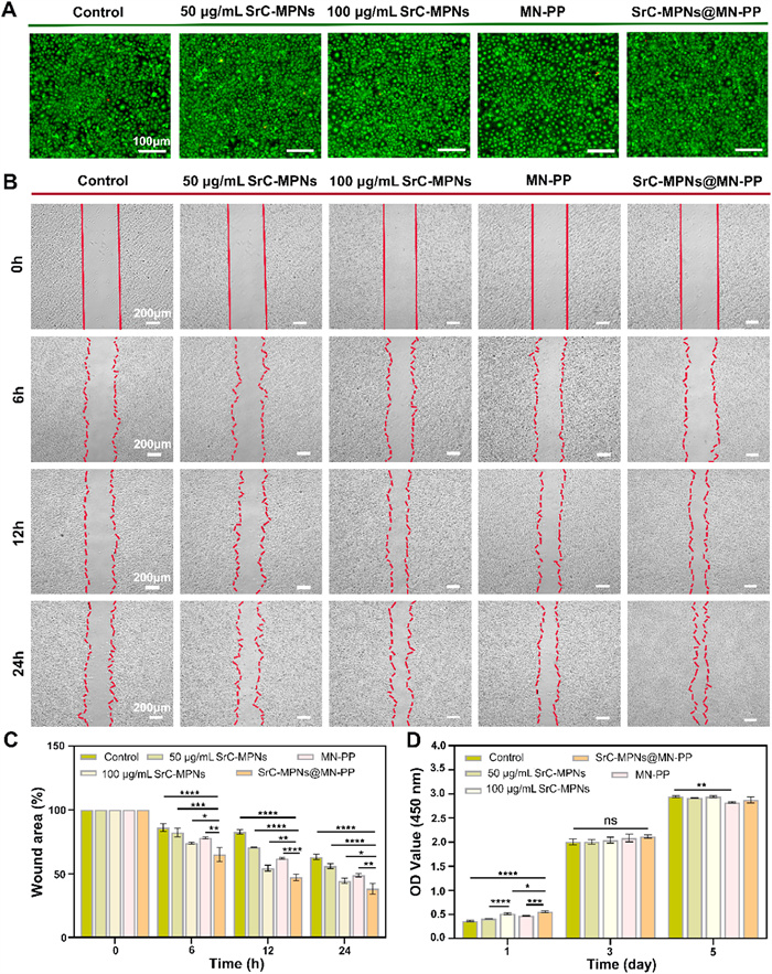 Ideal medical dressings should not only provide therapeutic benefits but also exhibit superior biocompatibility and minimized cytotoxicity. The biocompatibility and cytotoxicity of SrC-MPNs@MN-PP were evaluated in vitro. HUVECs were co-cultured with different processing groups. Live/dead cell staining was performed (Fig. 4A) to determine viability. Results confirmed that SrC-MPNs@MN-PP exhibited strong biocompatibility and lacked cytotoxic effects. The cell scratch method was employed to gauge the impact of different processing groups on cell migration and proliferation. Compared to the control group, all treatment groups notably enhanced cell migration and proliferation, with SrC-MPNs@MN-PP showing the most pronounced effects (Figs. 4B and C). In summary, SrC-MPNs@MN-PP has excellent biocompatibility in vitro and promotes cell proliferation and migration, which is expected to find applications in the medical industry in the future. The biocompatibility of SrC-MPNs@MN-PP was evaluated by measuring the absorbance optical density (OD) values of fibroblasts at 1, 3, and 5 days using the cell counting kit-8 (CCK-8) assay. The experimental results show that SrC-MPNs@MN-PP exhibit no significant cytotoxicity and good biocompatibility (Fig. 4D).