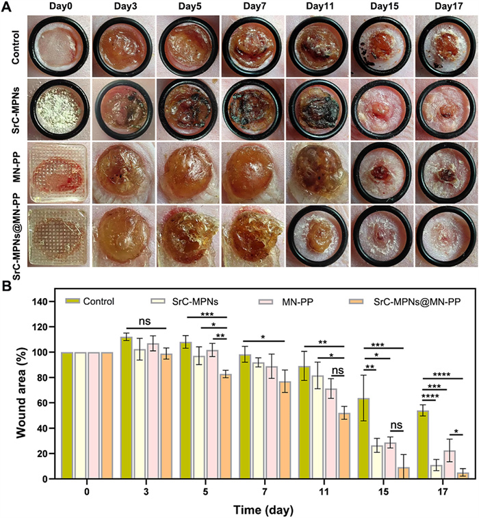 To evaluate the effectiveness of SrC-MPNs@MN-PP in wound healing, a diabetic mouse model was created with an incision. The experimental procedures were carried out in compliance with the institutional regulations for the care and utilization of laboratory animals and protocols, which were sanctioned by the Animal Care and Use Committee of Shanghai Ninth People’s Hospital. After surgery, mice were divided into four groups: control group, SrC-MPNs powder, MN-PP, and SrC-MPNs@MN-PP. Wound progression in different treatment groups was monitored at day 0, 3, 5, 7, 11, 15, and 17 (Fig. 5A). It was observed that the MN patch melted once applied to the wound and remained in place until the wound healed. By day 17, the wounds in the SrC-MPNs@MN-PP group were mostly healed, whereas those in other groups were not fully recovered. The percentage of wound area on different days was quantified (Fig. 5B). While all treated groups showed improved wound healing compared to the control, the SrC-MPNs@MN-PP group was notably more effective.