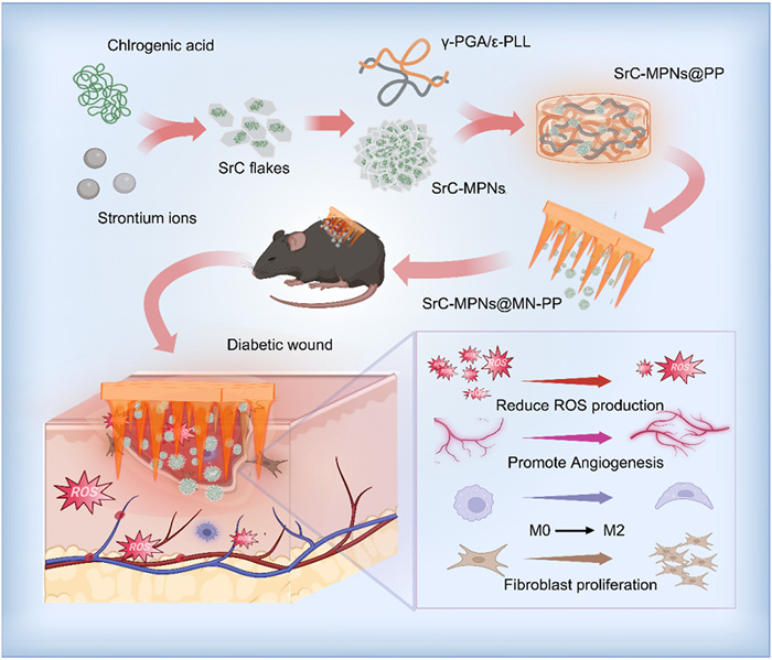 | Scheme1. Schematic of the SrC-MPNs@MN-PP mechanism promoting healing in diabetic wound healing (Image was created with BioRender). | |
