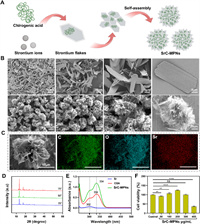| Fig. 1. Synthesis and properties of SrC-MPNs. (A) Schematic representation of SrC-MPN synthesis. (B) SEM image showcasing the self-assembly process of SrC-MPNs structures. (C) Elemental distribution within SrC-MPNs. (D) XRD patterns of SrC-MPNs powder. (E) Concurrent absorption profiles of Sr, CGA, and SrC-MPNs. (F) Cytotoxicity assessment of SrC-MPNs on HUVECs across various concentrations (0, 50, 100, 200, 300, 400 µg/mL) over 48 h. Statistical evaluations were performed with n = 3 replicates. All experimental results were expressed as a mean ± standard deviation (SD). **P < 0.01, ****P < 0.0001. ns, not significant. | |