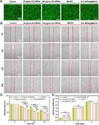 | Fig. 4. In vitro assessment of biocompatibility, and the proliferative and migratory effects of SrC-MPNs@MN-PP. (A) HUVECs were co-cultured for 48 h with extracts of SrC-MPNs (50, 100 µg/mL), MN-PP, or SrC-MPNs@MN-PP (containing approximately 100 µg/mL SrC-MPNs). A medium supplemented with 10% serum served as the control. Subsequently, cell viability was assessed using specific live/dead stains, with results visualized under fluorescence microscopy. B) Fibroblasts co-cultured with different treatment groups were subjected to a scratch assay to evaluate cellular migration and regeneration. (C) Quantitative analysis of wound closure rates across various treatment groups, corresponding to (B). (D) Proliferative responses of fibroblasts post-treatment were quantified by measuring optical density (OD) values over 1, 3, and 5 days. All experimental results were expressed as a mean ± SD, n = 3. P < 0.05, **P < 0.01, ***P < 0.001, ****P < 0.0001. | |