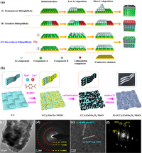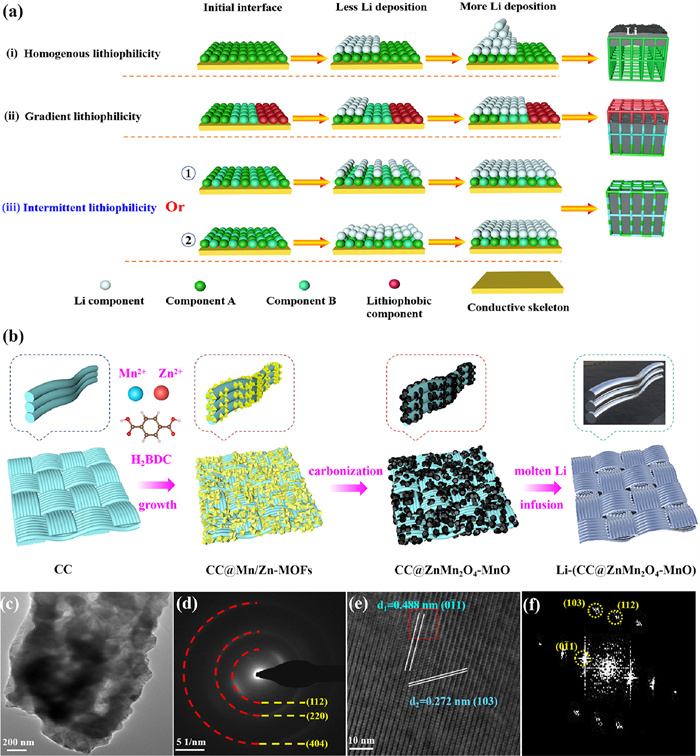 | Fig. 1. (a) Mechanism diagram of Li component deposition on conductive frameworks with different interfacial activities: (ⅰ) homogenous interfaces (top growth); (ⅱ) gradient interfaces (bottom-up growth); (ⅲ) intermittent interfaces. (b) Schematic illustration of the preparation processes of the Li-(CC@ZnMn2O4-MnO) composite anode. Characterizations of the CC@ZnMn2O4-MnO electrodes. (c) TEM image; (d) SAED pattern; (e, f) HRTEM images. The tested particles were scraped off from CC@ZnMn2O4-MnO electrodes. | |