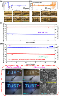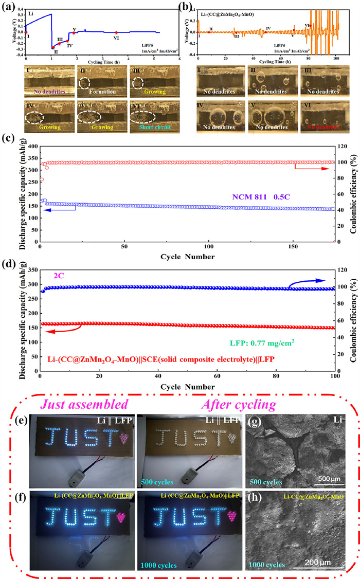 | Fig. 4. In situ optical photographs of (a) pure Li and (b) Li-(CC@ZnMn2O4-MnO) electroplating process at different times at a current density of 1 mA/cm2 in the Ester liquid electrolyte (LiPF6: Ester-based electrolyte). Electrochemical performance of full cells. (c) Long-term cycling performance of Li-(CC@ZnMn2O4-MnO)||NCM811 full cells at 0.5 C (1 C = 180 mAh/g). (d) Long-term cycling performance of Li-(CC@ZnMn2O4-MnO) in all-solid-state lithium-ion batteries (Li-(CC@ZnMn2O4-MnO||SCE(solid composite electrolyte)||LFP) at 2 C. Illuminated LED lights powered by (e) Li||LFP and (f) Li-(CC@ZnMn2O4-MnO)||LFP full cells. SEM images after cycling in different full cells. (g) Li||LFP, (h) Li-(CC@ZnMn2O4-MnO)||LFP full cells. | |