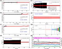 | Fig. 3. Coulombic efficiency at various current densities of the CC and CC@ZnMn2O4-MnO electrode with 1 mAh/cm2. (a) 1 mA/cm2, (b) 3 mA/cm2, (c) 5 mA/cm2. Electrochemical performance comparisons of the Li-(CC@ZnMn2O4-MnO) (red) and pure Li foil (black) symmetric cells. Cyclic stabilities with different Li capacities at various current densities of (d) 3 mA/cm2, 1 mAh/cm2, (e) 3 mA/cm2, 3 mAh/cm2, (f) 10 mA/cm2, 10 mAh/cm2. (g) Rate performance of symmetric Li cells with Li-(CC@ZnMn2O4-MnO) electrodes (1 mAh/cm2) at various current densities. (h) Long-term cycling performances of Li-(CC@ZnMn2O4-MnO)||LFP full cells from 2 C to 20 C (1 C = 170 mAh/g). | |