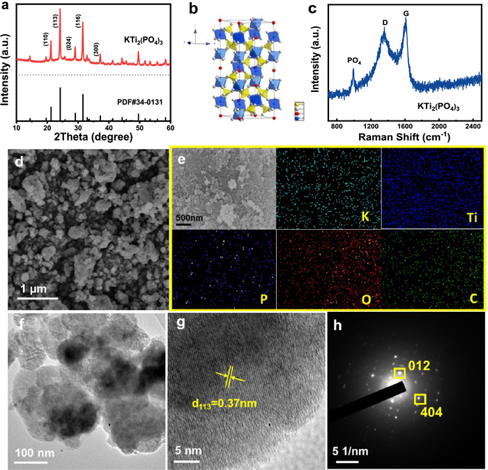 | Fig. 1. Structure and composition of the prepared KTi2(PO4)3. (a) XRD pattern. (b) Crystal structure. (c) Raman spectrum. (d) SEM image. (e) Elemental mapping images of K, Ti, P, O and C. (f) TEM image. (g) HRTEM image with (h) the corresponding SAED pattern. | |